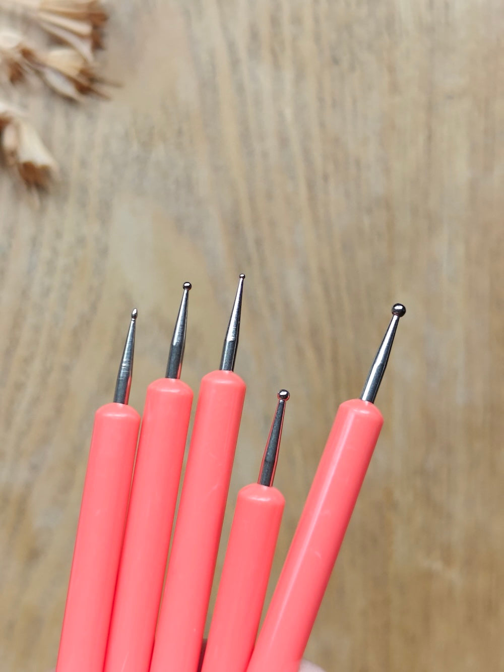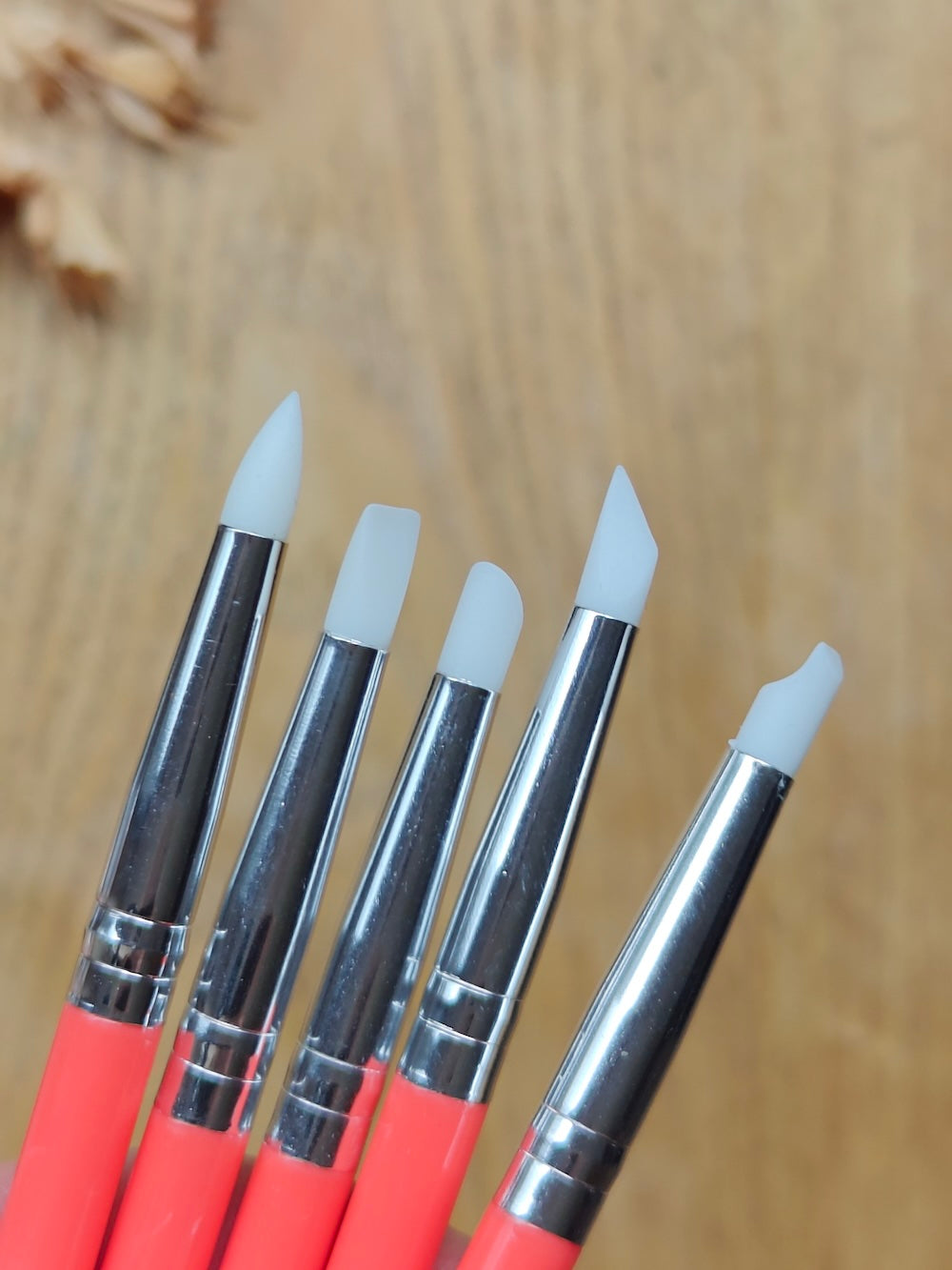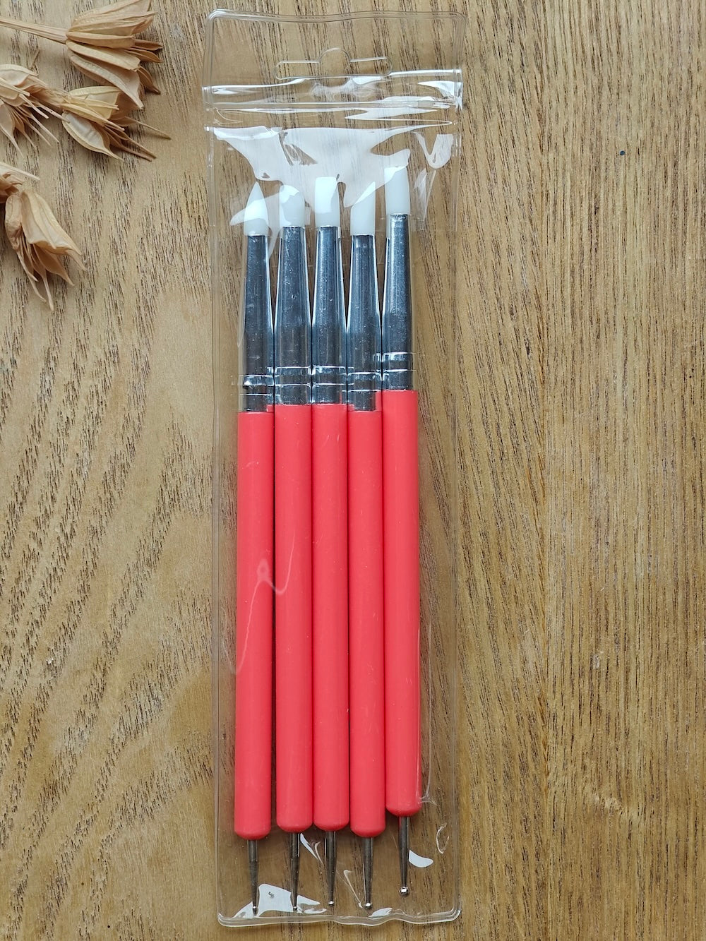 Muotoilutyökalut 5kpl. Toisessa päässä silikonipää, toisessa pallopää esimerkiksi massantyöstöä ja pisteiden tekoa varten.