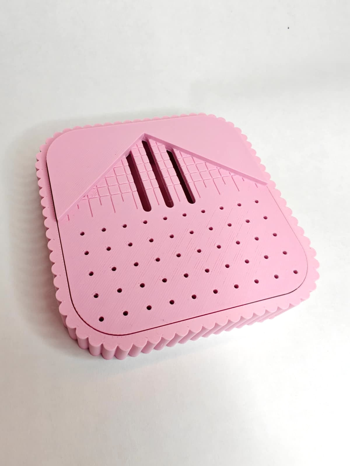 Monikäyttöinen porausalusta, jolla saat porattua reiän polymeerimassa- tai hartsikorulle symmetrisesti juuri oikeaan kohtaan. Mukaan tulee myös kätevä reikälevy, joka helpottaa ylimääräisen maissitärkkelyksen kopauttamista rasiaan polymeerimassatöissä. Kannessa on myös pieniä reikiä, johon voit laittaa nappikorvakoruja kiinni työstämistä varten.
