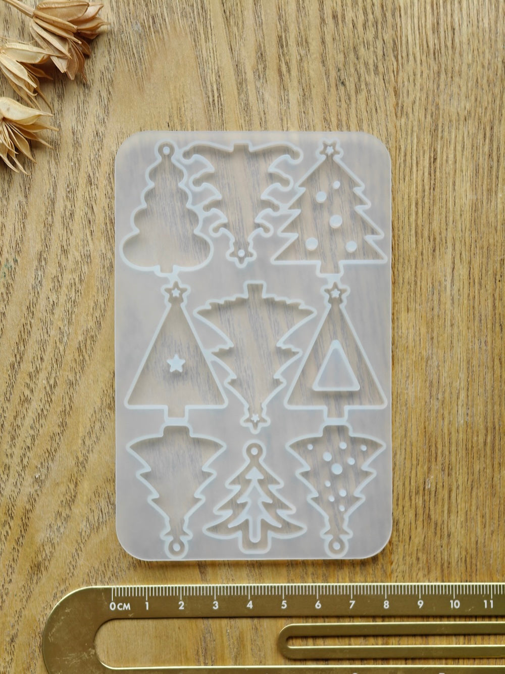 Silikonimuotti kuusiaiheisten korvakorujen, avaimenperien tai pienten kuusenkoristeiden tekoon. Käytä valamineen UV Hartsia, epoksihartsia tai ekohartsia.